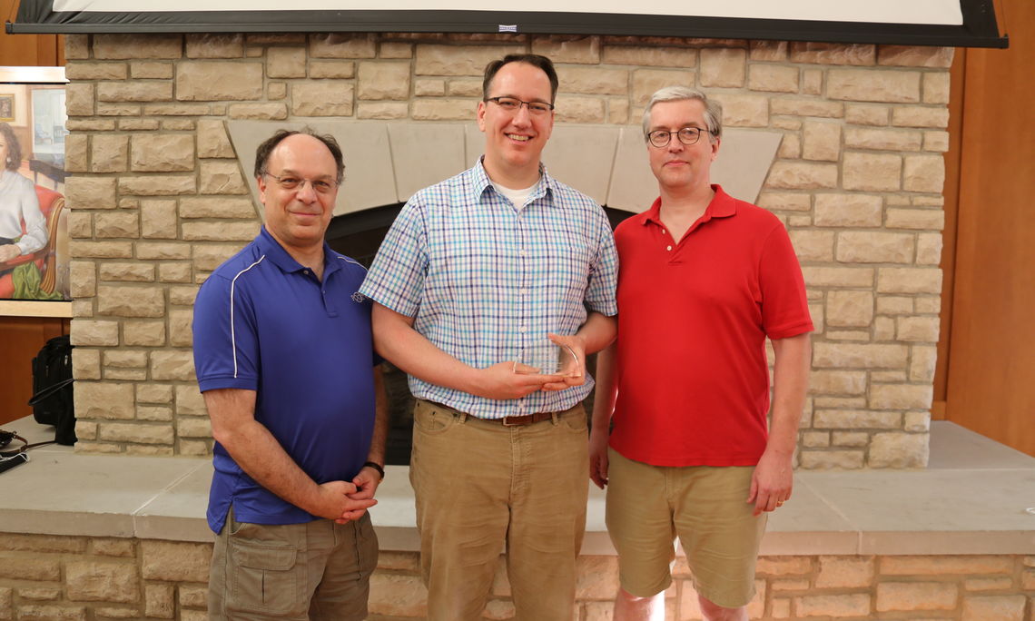 Chris Mayfield (middle), recipient of the 2019 POGIL PEACH Award (post-secondary) with Project Director Rick Moog (left) and Clif Kussmaul of Green Mango Consulting (presenter).